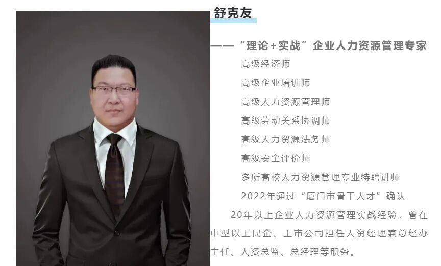本次论坛为400人规模,论坛旨在为各个行业的HR搭建经验分享和趋势解读的平台。 时间 主题/演讲嘉宾 13:00—14:00 签到入场 14:00—14:10 嘉宾致辞 14:20—14:30 2023年管理咨询项目补助政策宣讲 14:30—15:10 演讲嘉宾:薛磊 宏观经济、战略专家 演讲主题:拥抱“不确定”,中小企业的机遇与挑战 15:10—15:50 演讲嘉宾:舒克友 上市企业 HRD 演讲主题:企业数字化转型,领导力与人才发展 15:50—16:00 幸运抽奖&茶歇 16:00—16:30 演讲嘉宾:涂满章 博士 思明区政协委员 同博咨询董事长 演讲主题:企业敏捷经营必答的四个问题和一套支撑体系 16:30—17:00 演讲嘉宾:程温富 精航咨询创始人 总经理 演讲主题:精益智能视野下的人力资源 17:00—17:30 圆桌论坛 主持嘉宾:涂满章 博士 思明区政协委员 同博咨询董事长 研讨主题:人工智能(AI)如何改变人力资源管理的选|育|用|留 17:30—18:00 总结/合影留念